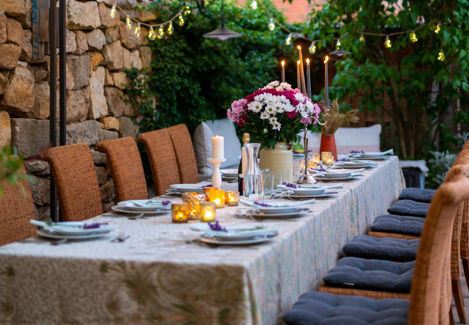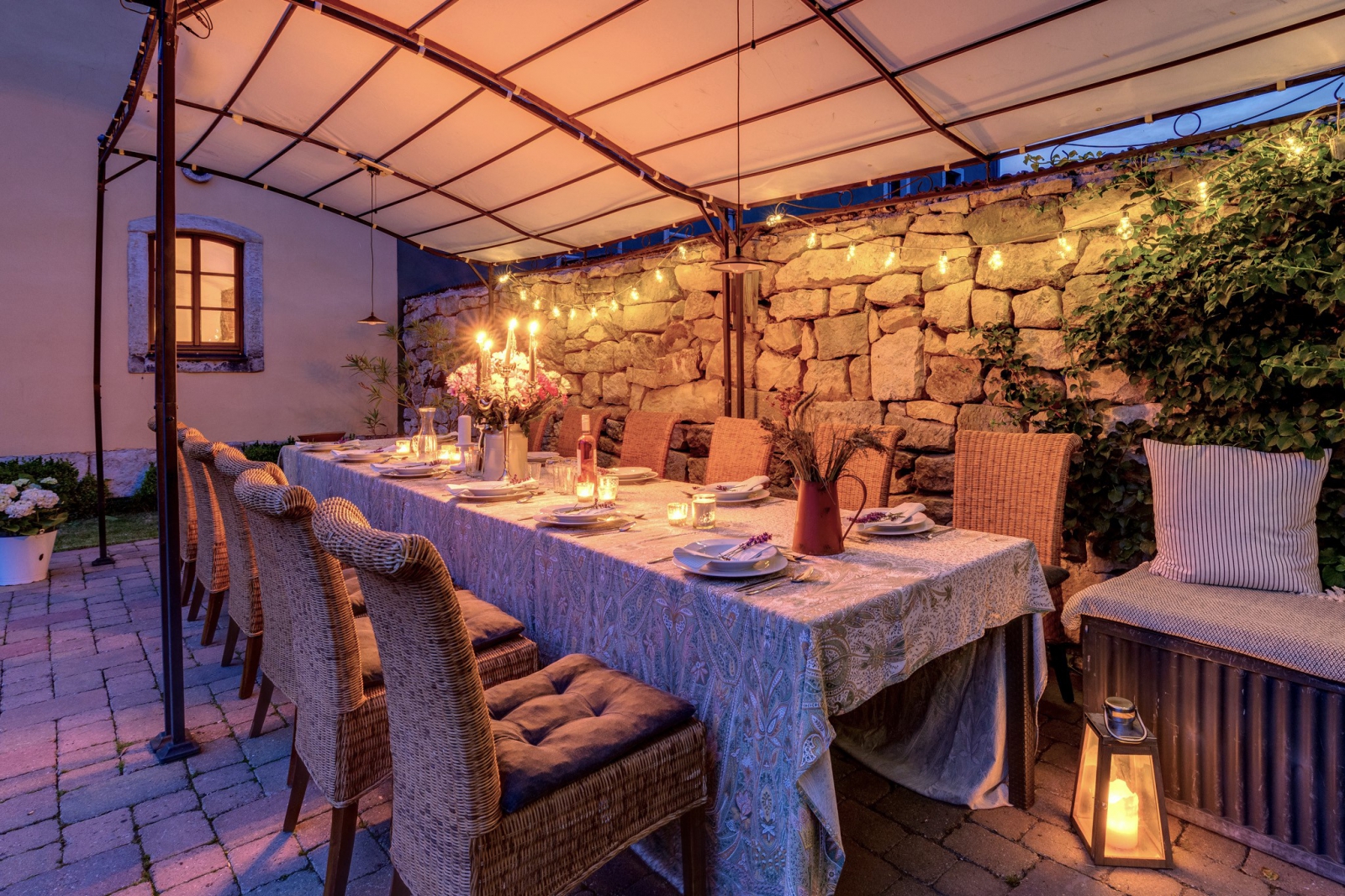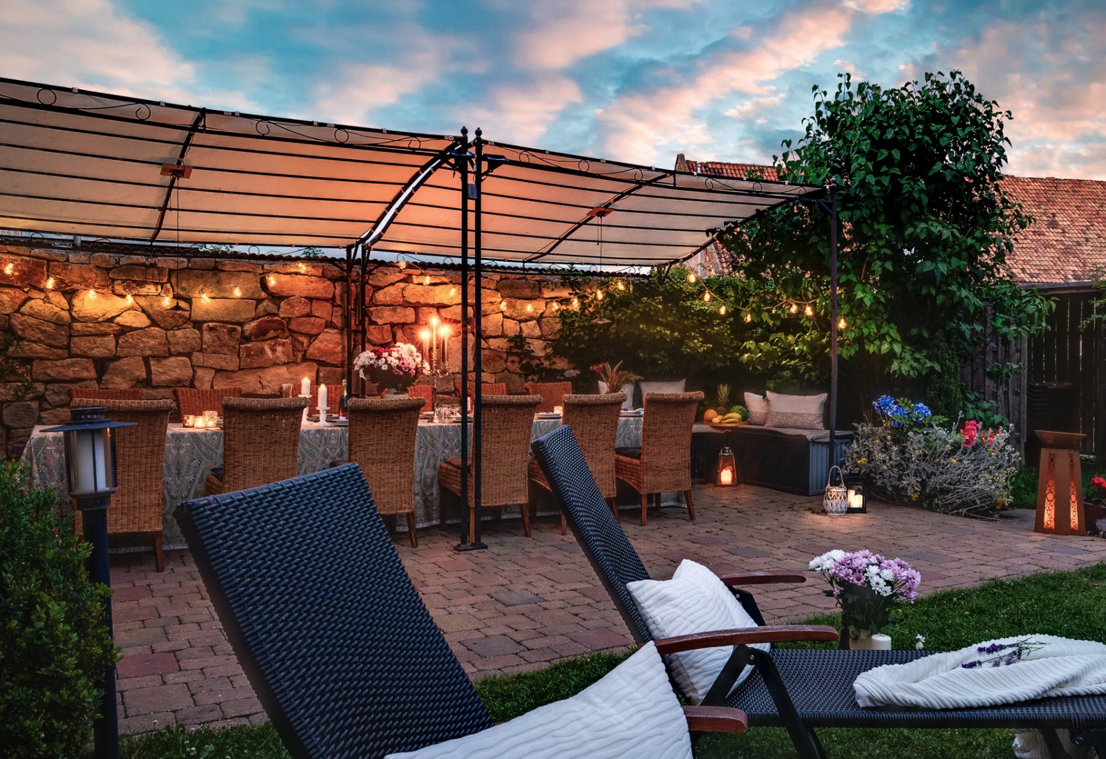 Außenbereich: Terrasse mit Gartenmöblierung, umzäunter Garten, Grillplatz.