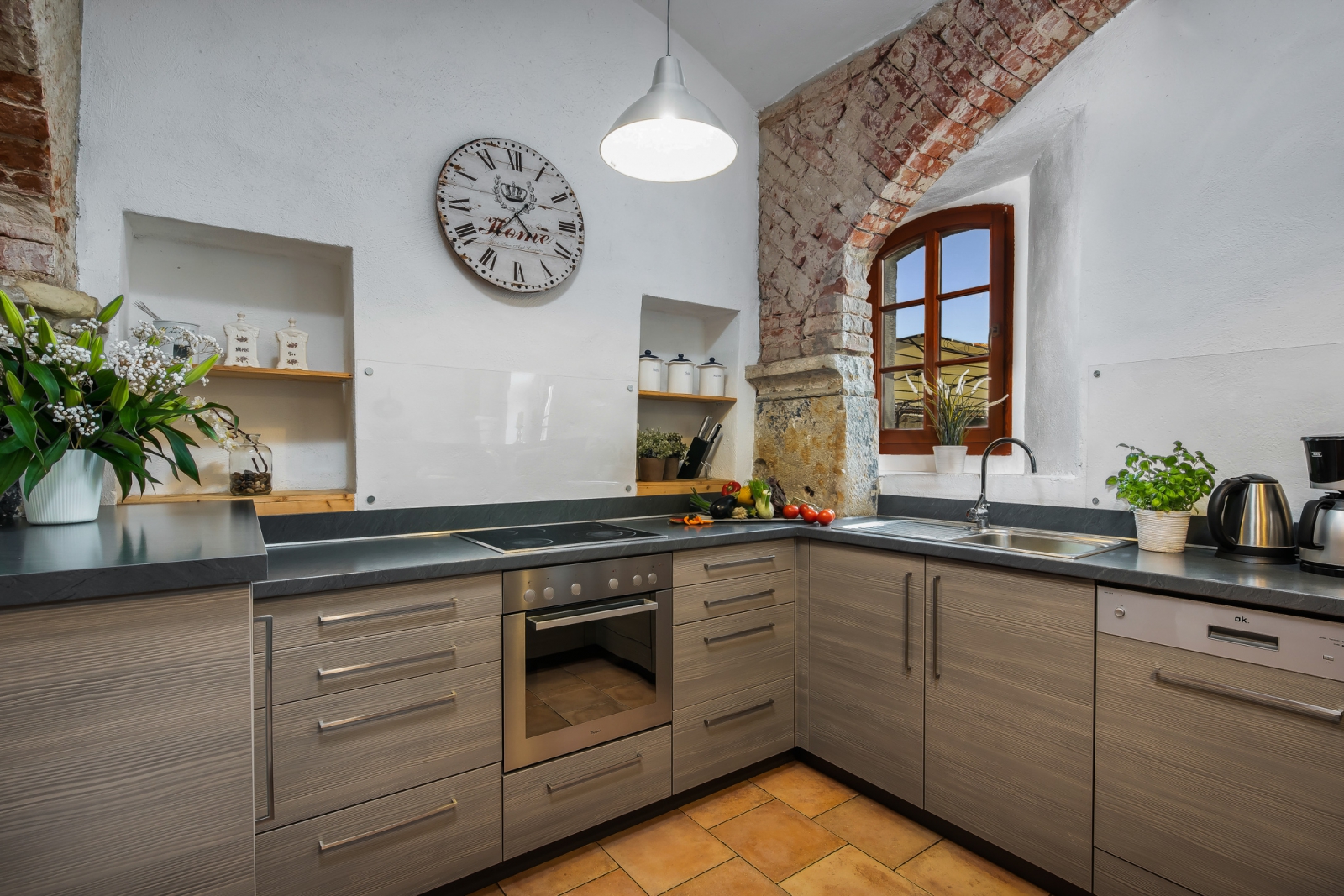 Küche: Herd mit Backofen, Kühlschrank mit Gefrierfach (XL) , Geschirrspüler, Mikrowelle, Kaffemaschine, Tassimo Kapselmaschine