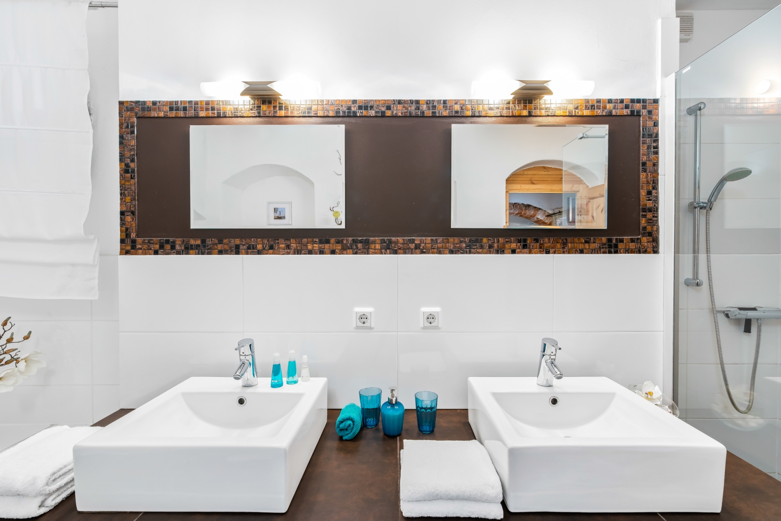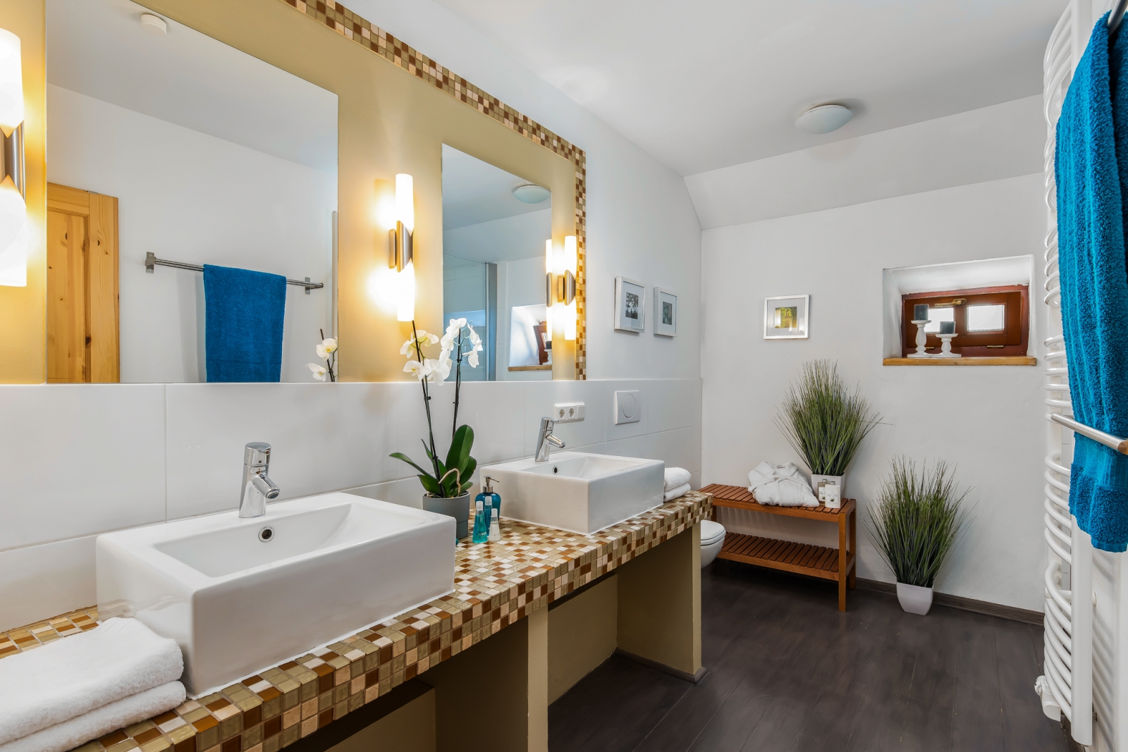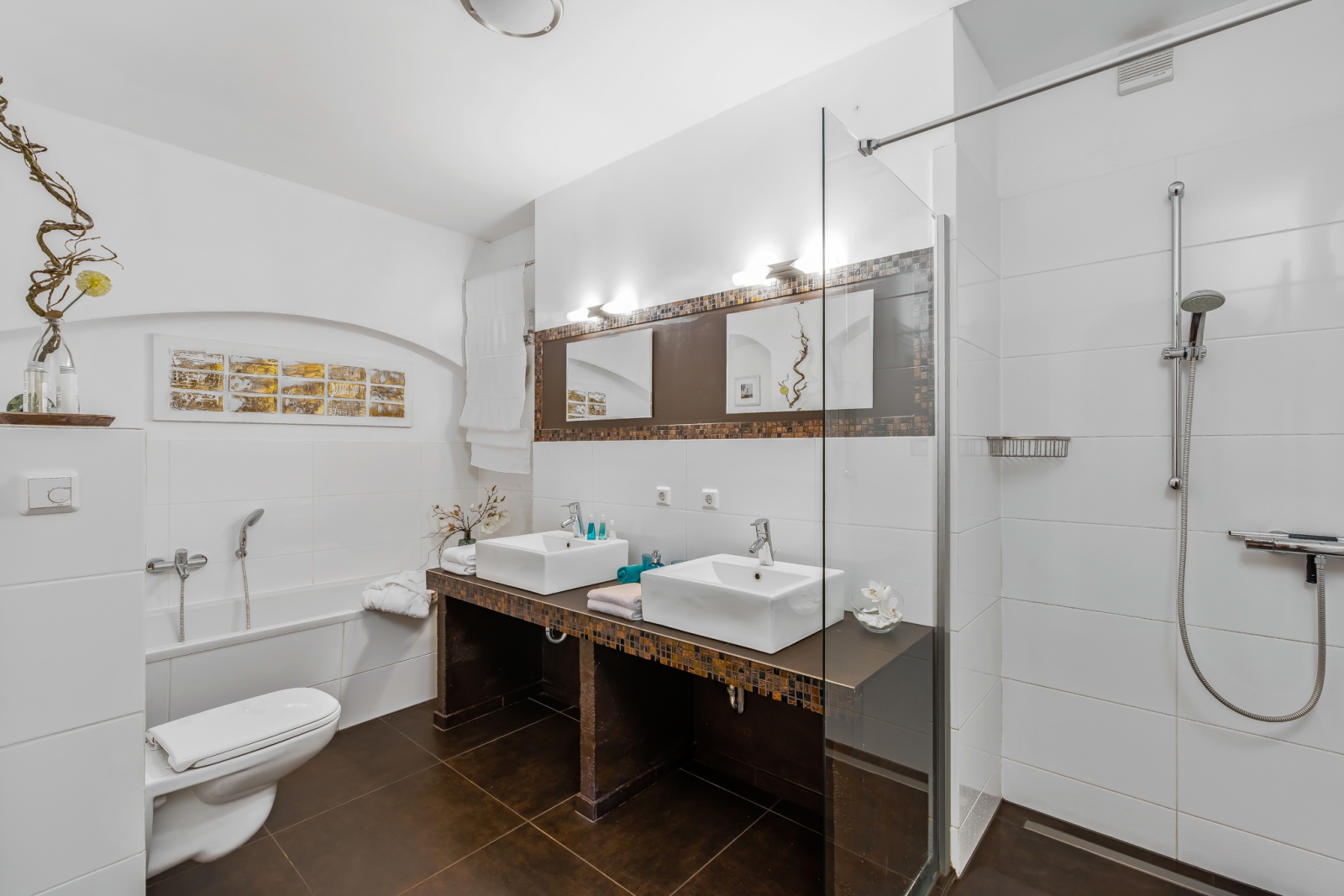 Bad: 1. Duschbad mit Wanne, Doppelwaschtisch, WC im EG, 2. Duschbad mit Doppelwachtisch und 2. WC im OG, 3. Gäste-WC im OG