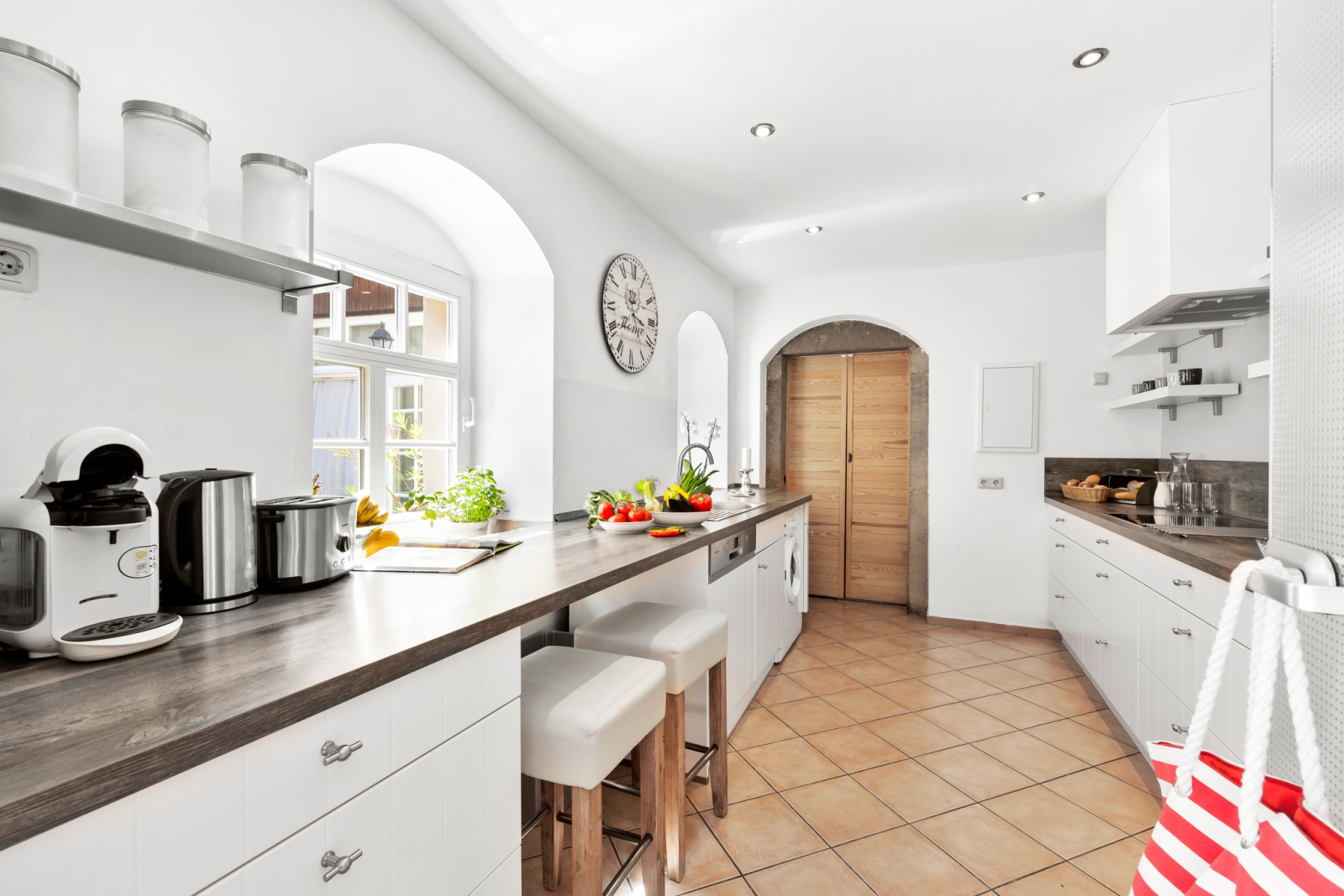 Küche: Herd, Dunststabzugshaube, Backofen, Kühlschrank mit Gefrierfach, Geschirrspüler, Mikrowelle, Kaffeemaschine, Kapselmaschine ( Bosch Tassimo Kaffeeautomat )