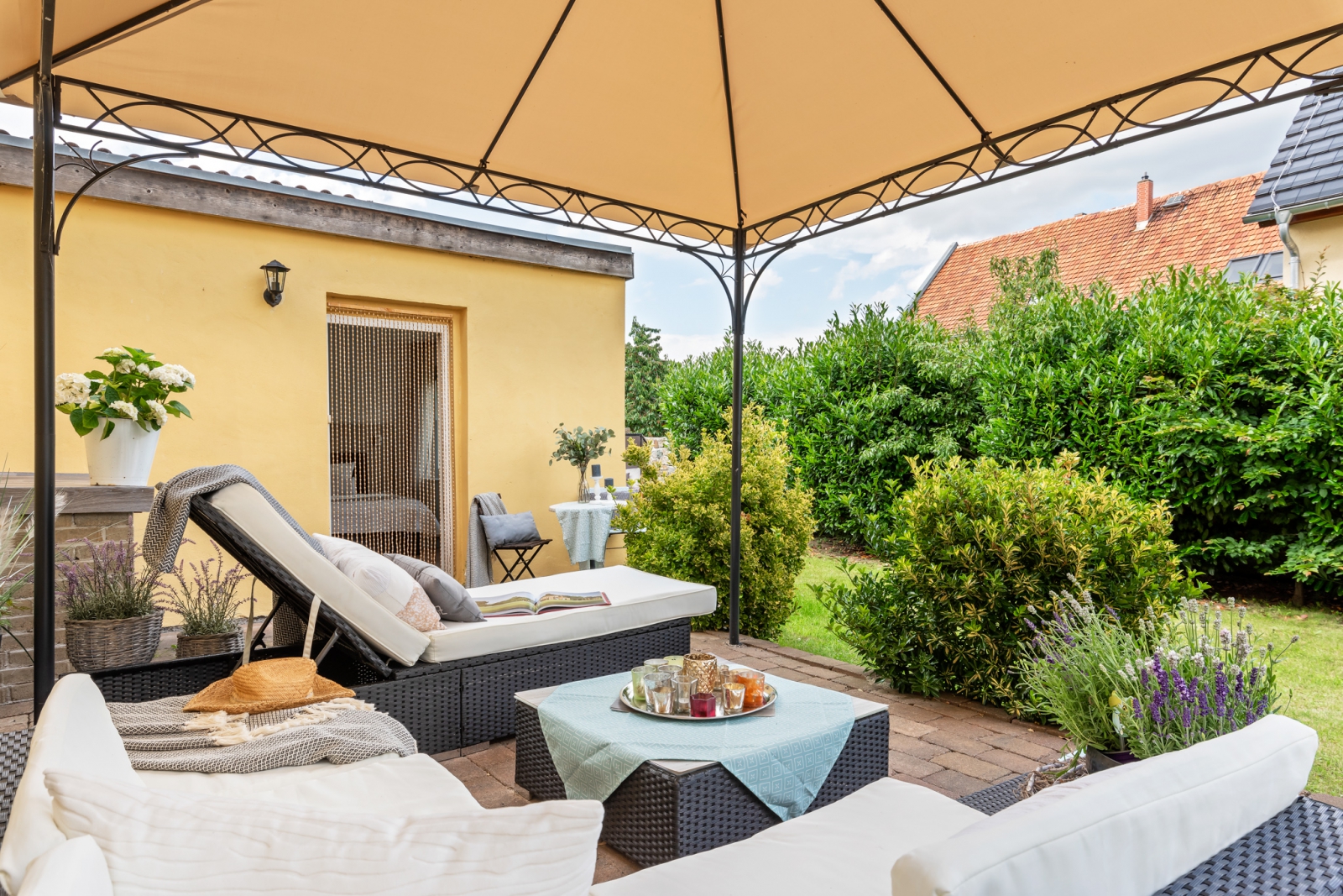 Außenbereich: 1. Terrasse mit Gartenmöblierung im Hof , 2. Terrasse im Garten, Grillplatz.